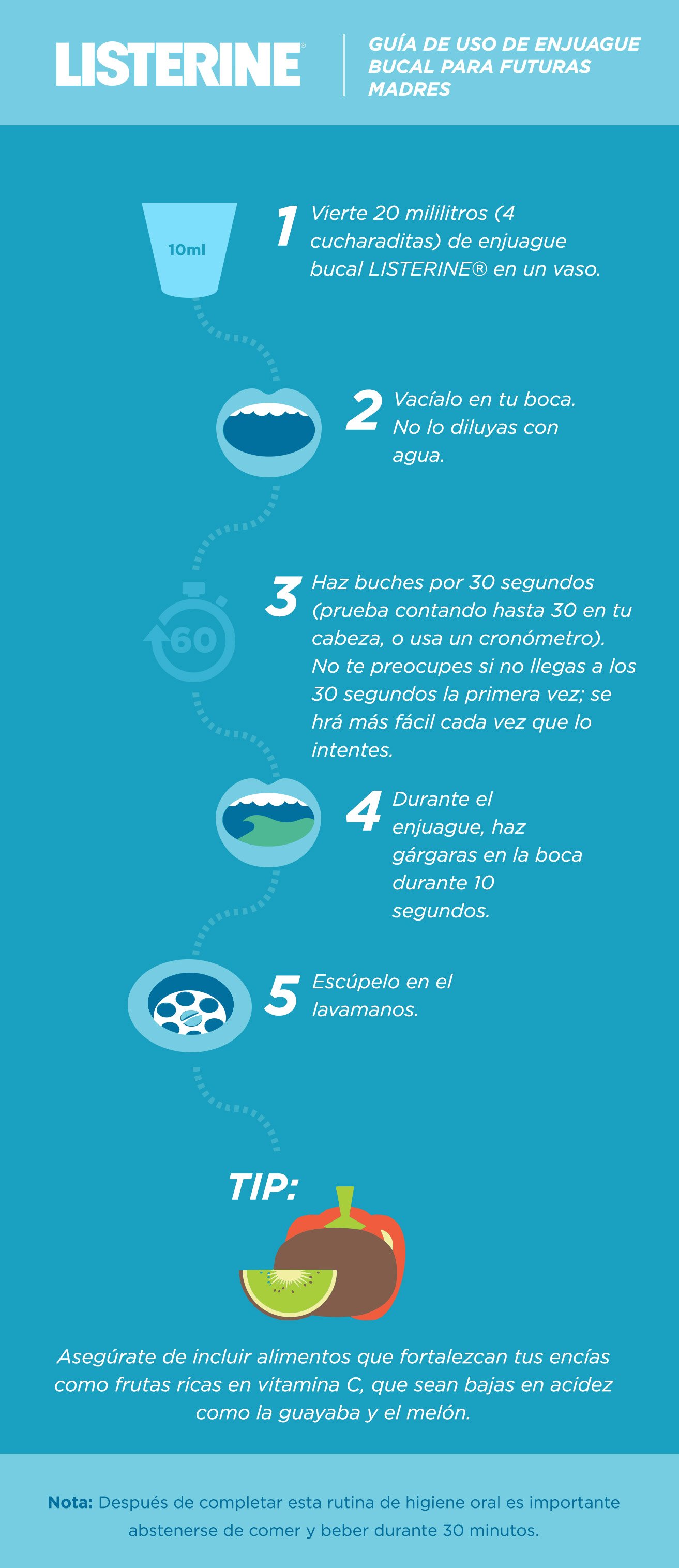 Para proteger tu salud bucal, completala con enjuague bucal dos veces al día para que tengas una cosa menos de qué preocuparte en los próximos nueve meses..